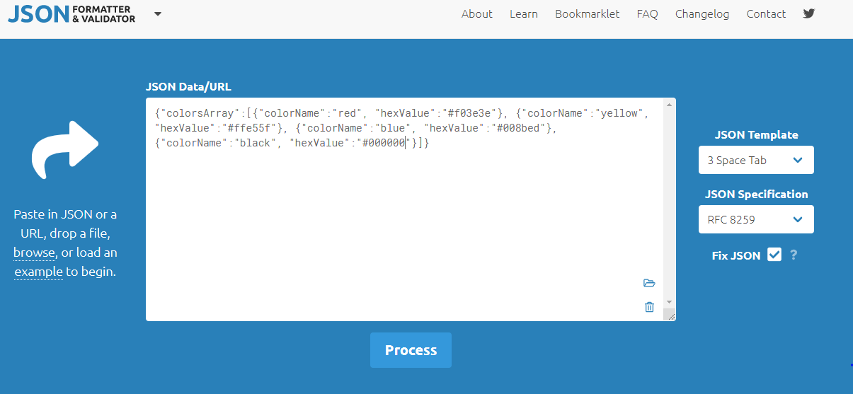 사이트 중앙에 InputText 영역에 JSON 데이터를 입력하고 하단 "Process" 버튼만 클릭하면 된다.