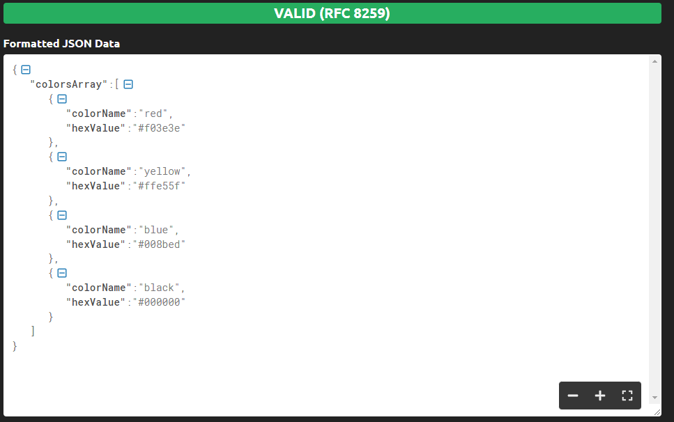 버튼을 클릭하면 하단에 결과가 출력된다. VALID / INVALID 데이터를 구분해주며, Array와 Object를 보기 좋게 행으로 구분해준다.