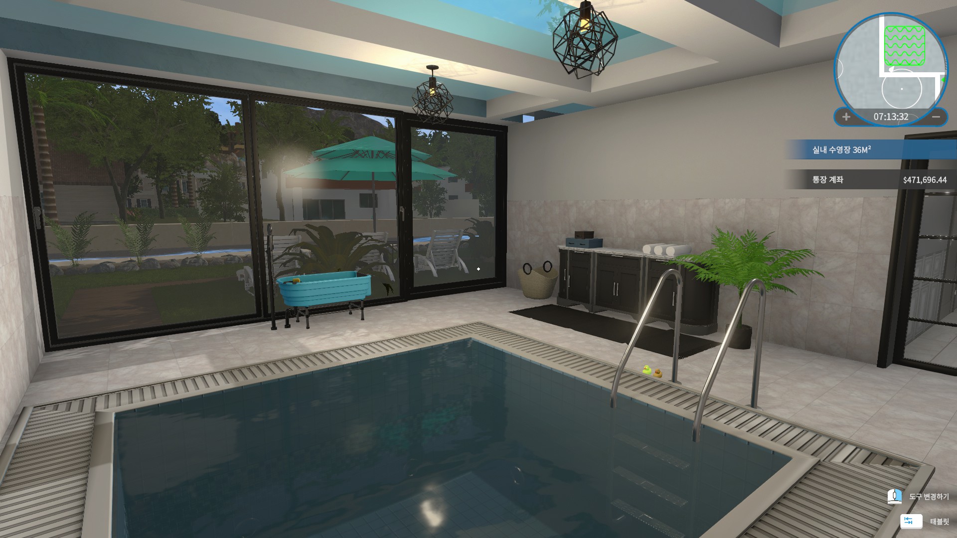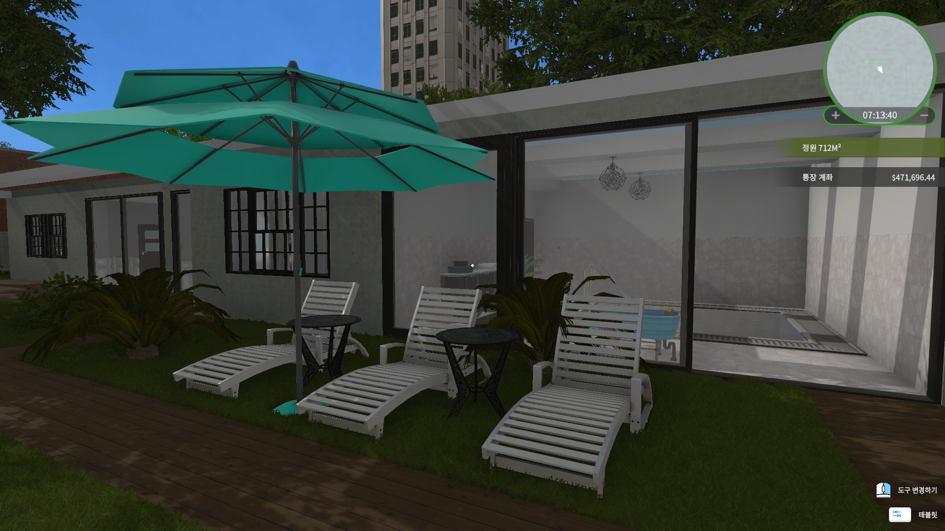 해당 집의 퀘스트에서도 이 부분을 실내 수영장으로 꾸며주는데, 천장이 유리이기 때문에 방보다는 수영장이 어울릴 것 같아 나도 수영장을 추가했다! 마당으로 나가면 선베드에서 일광욕을 즐길 수 있도록 했다.