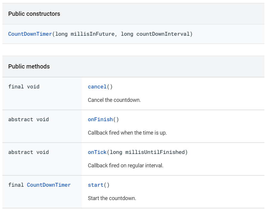 - millisInFuture : 타이머의 작동 시간의 밀리초 값. 종료시간 - 시작시간 의 밀리값을 넣으면 된다.