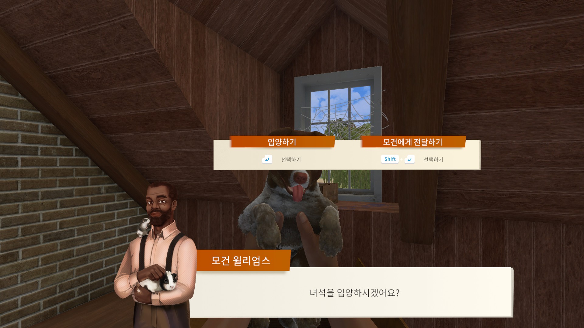 만약 입양을 하면 집을 수리하는동안 나를 따라다니고, 보호소를 선택하면 그 자리에서 바로 사라진다.