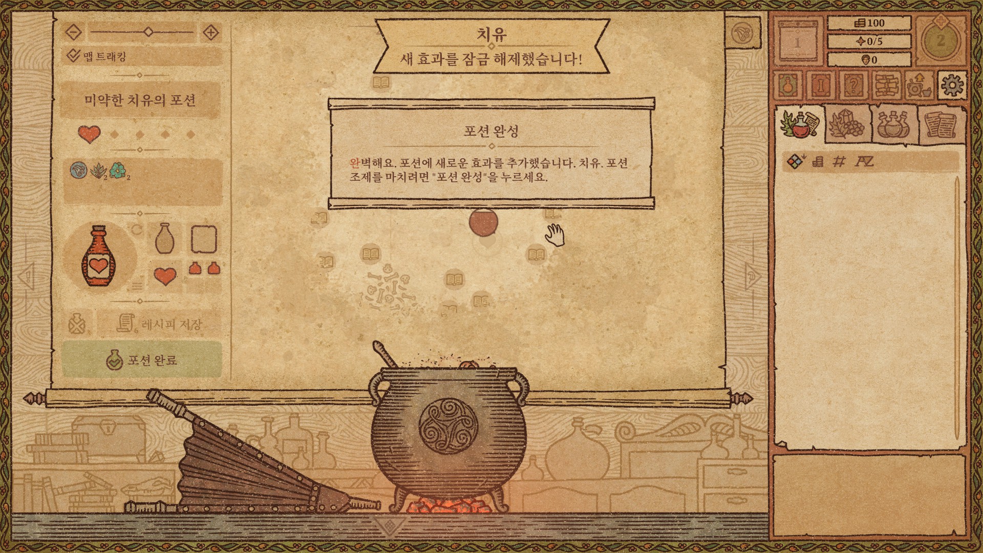 가열이 완료되면 포션이 완성된다. 좌측 메뉴를 통해 라벨이나 병의 모양이 변경 가능하며 포션 완료를 누르면 포션이 완성되는 시스템이다.