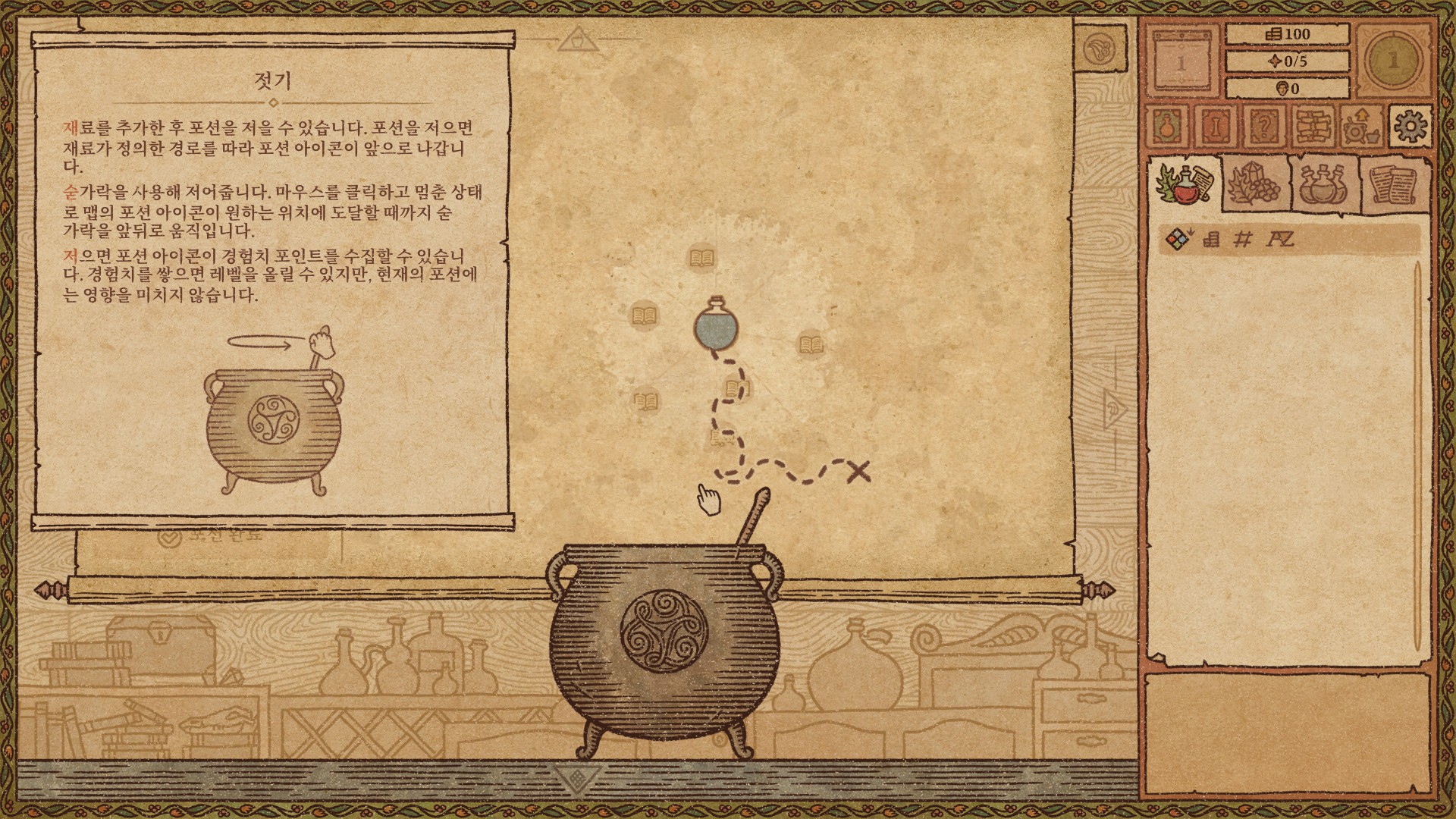 재료를 추가하면 가마솥의 숟가락 아이템으로 저어줄 수 있다. 재료들을 저어주면 가운데 맵에서 포션이 표시된 길대로 움직이기 시작한다.
