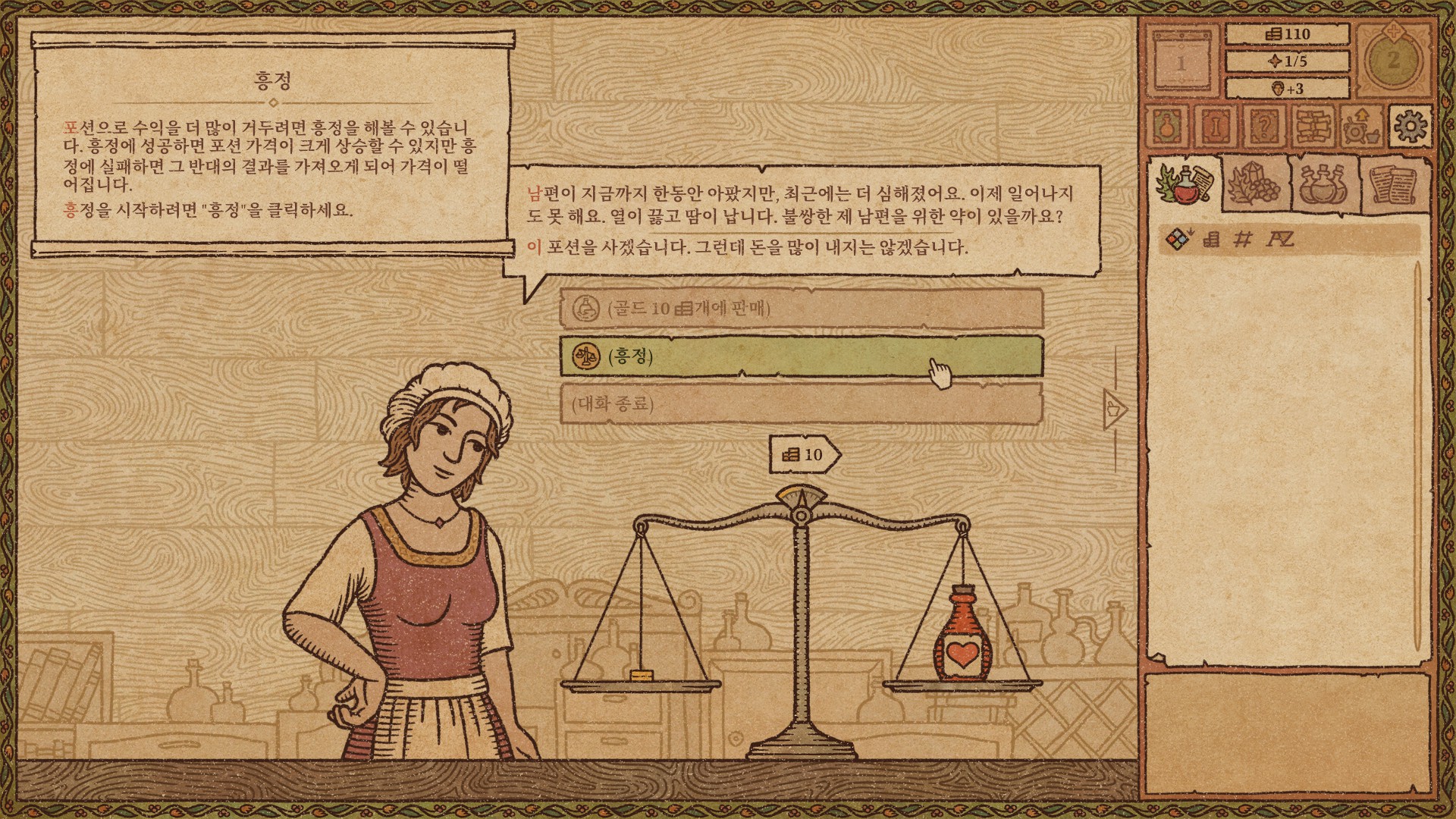 상점 역시 드래그 앤 드롭으로 진행하며 그냥 제 값에 팔 수도 있고 흥정을 통해 가격을 올릴 수도 있다.