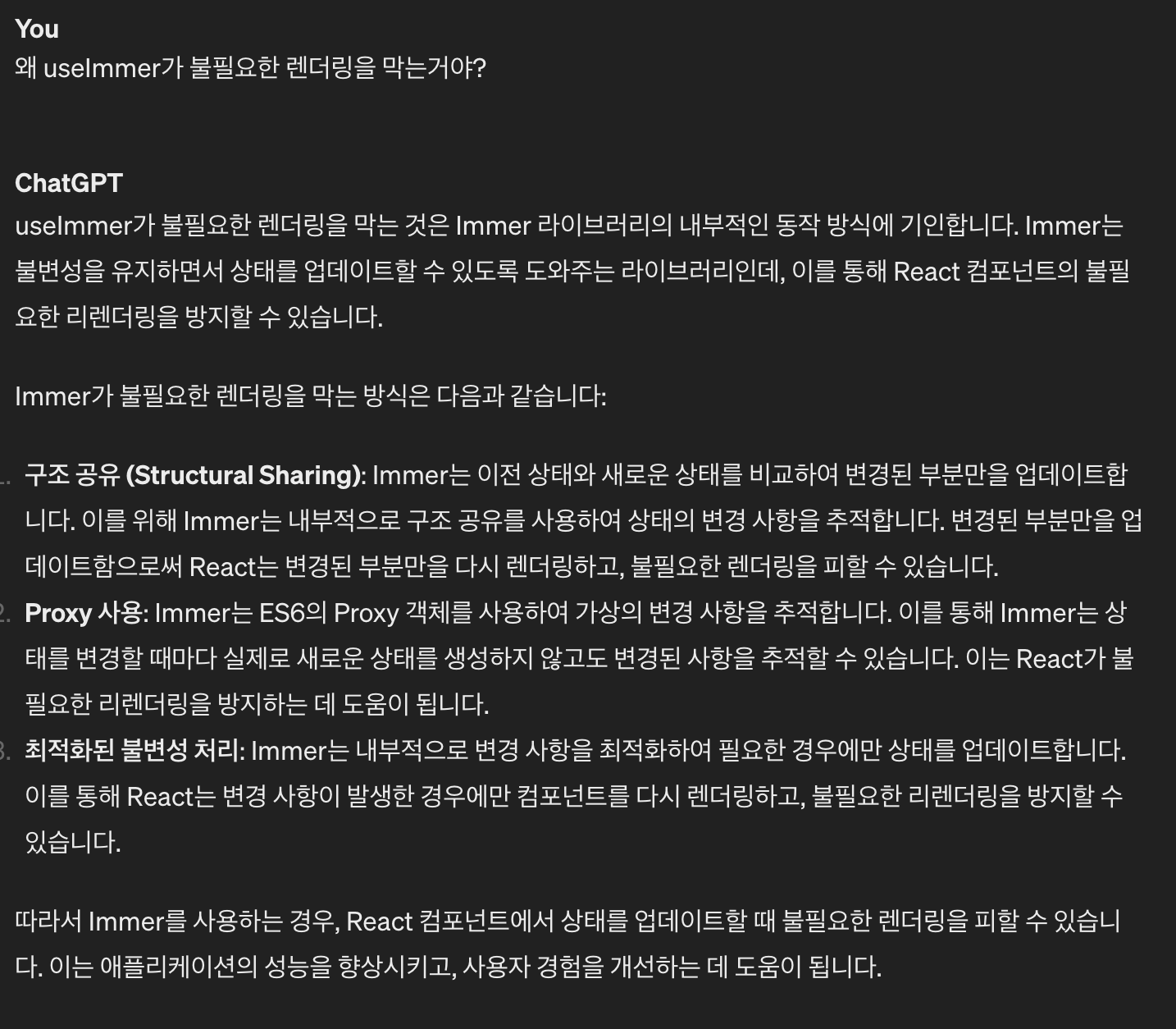 use-Immer의 특징인 ‘컴포넌트 상태 업데이트 최적화’에 대한 자세한 내용이 궁금해 GPT에게 질문해 보았다.