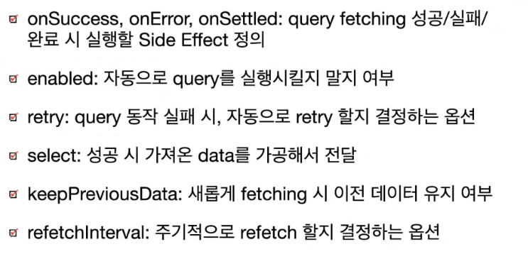 - status, isLoading, isSuccess, isLoading 등: query 상태