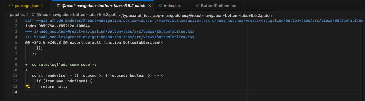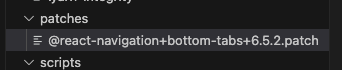 3. 프로젝트 폴더에 patches 폴더 생성 확인 및 @react-navigation+bottom-tabs+6.5.2.patch 파일 생성 확인